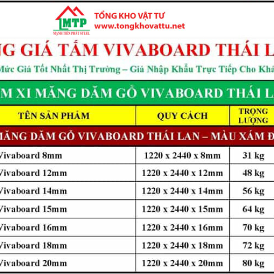 - Giá tấm Vivaboard Thái Lan sỉ và lẻ tại Tổng kho vật tư Mạnh Tiến Phát tốt nhất trên thị trường. Hàng luôn có sẵn với số lượng lớn tại kho.